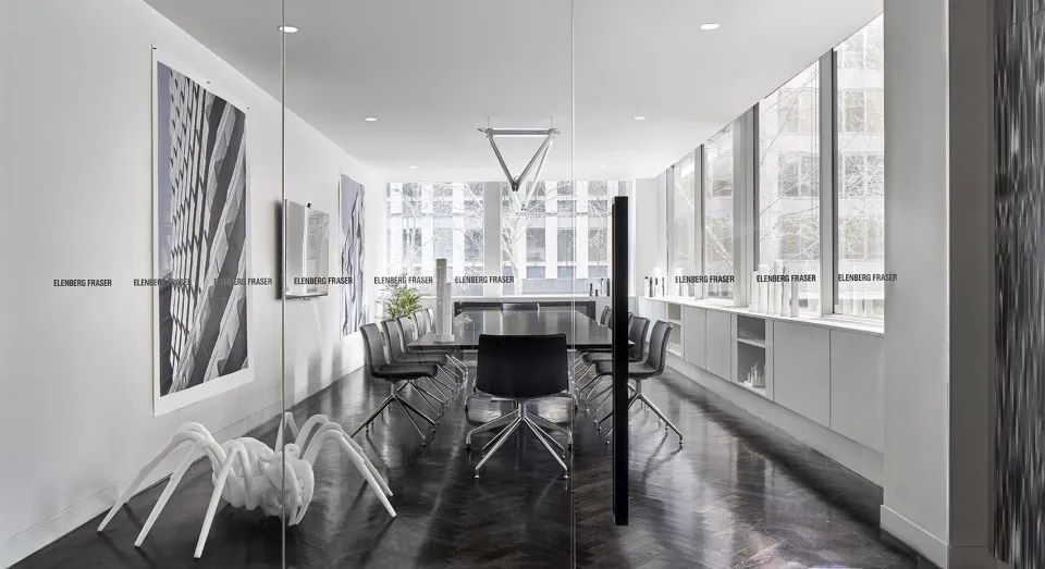 會議室設(shè)計的一大亮點(diǎn)是趴在地上的白色大型蜘蛛,增添藝術(shù)感的同時也頗具趣味,和黑色的地板形成明確反差。另一會議室則采用光滑的屏幕墻,營造時尚、科技感的會議室,同時還給配備了顯示器,既可展示3D設(shè)計、共享3D PDF文件,又可生成3D模型來記錄重要的交流過程。