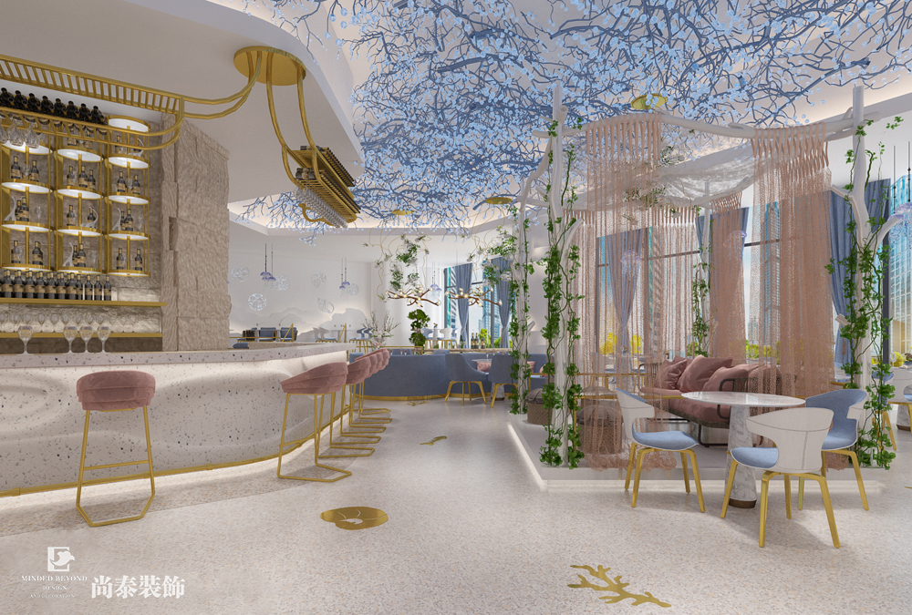 打造一個(gè)夢(mèng)幻般的海洋空間墻面造型采用海浪曲線,就餐區(qū)域